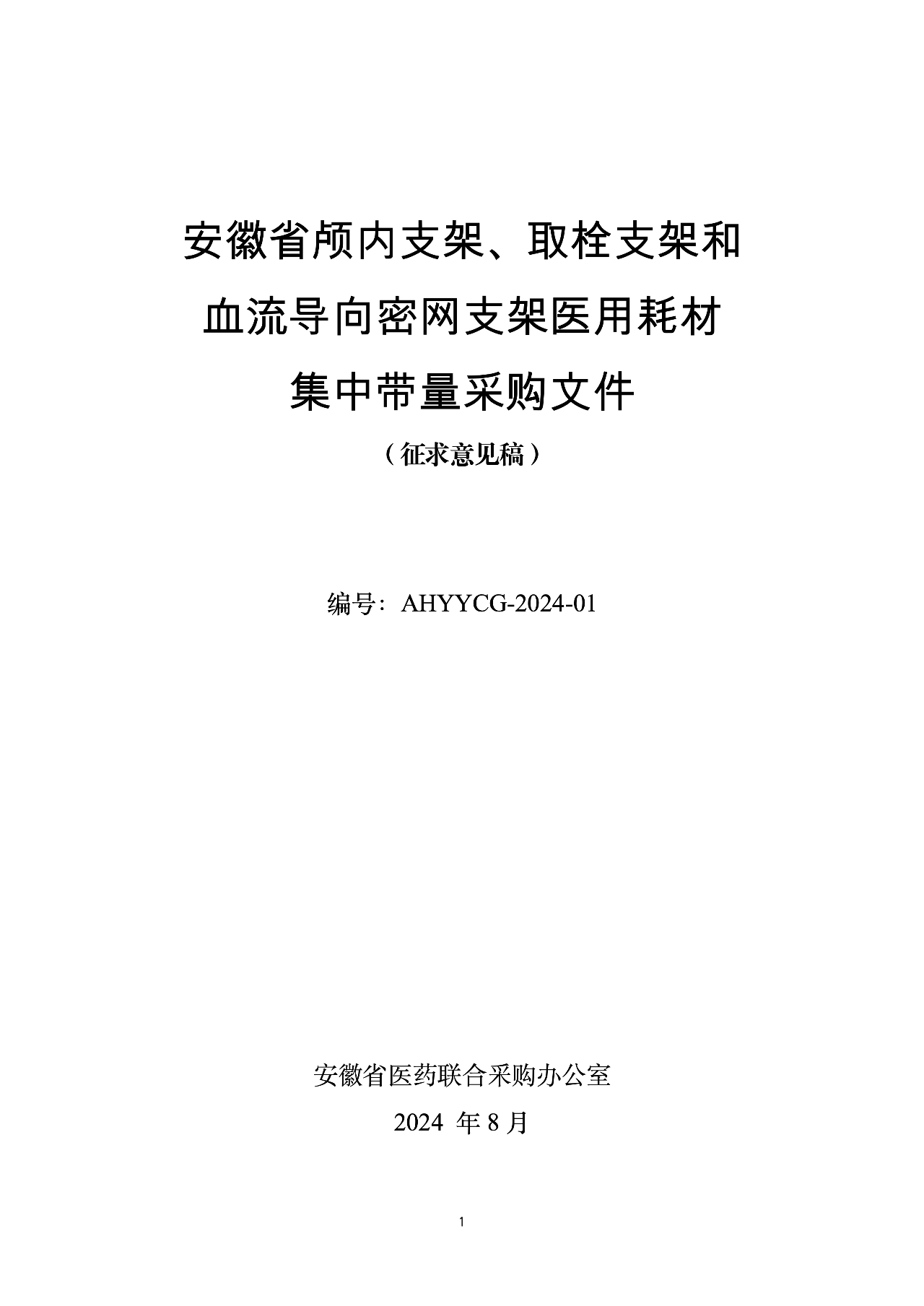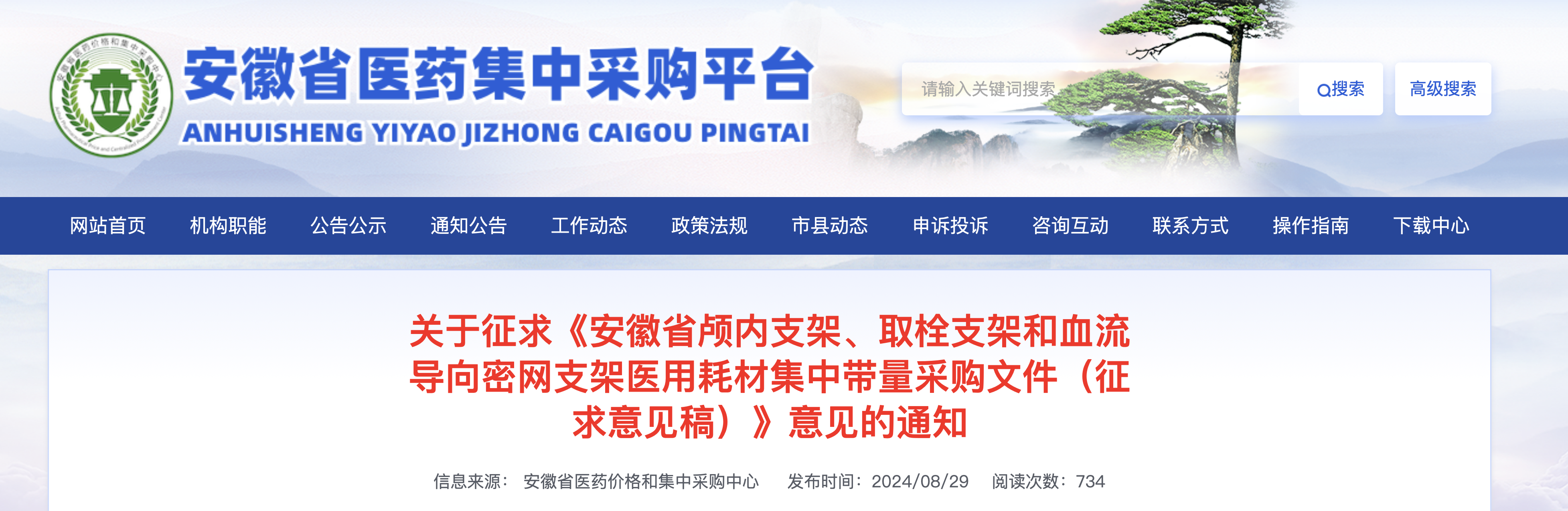 近日,安徽省醫藥價格和集中采購中心發布《安徽省顱內支架、取栓支架和血流導向密網支架醫用耗材集中帶量采購文件(征求意見稿)》(以下簡稱《征求意見稿》)(完整內容見文末),征求意見時間2024年8月29日至2024年9月4日。