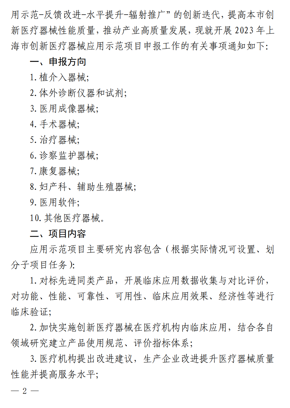 根據(jù)《通知》,為加快生物醫(yī)藥創(chuàng)新產(chǎn)品應(yīng)用推廣,支持創(chuàng)新醫(yī)療器械在醫(yī)療機構(gòu)開展應(yīng)用示范,形成“應(yīng)用示范-反饋改進-水平提升-輻射推廣”的創(chuàng)新迭代,提高上海市創(chuàng)新醫(yī)療器械性能質(zhì)量,推動產(chǎn)業(yè)高質(zhì)量發(fā)展,現(xiàn)就開展2023年上海市創(chuàng)新醫(yī)療器械應(yīng)用示范項目申報工作。