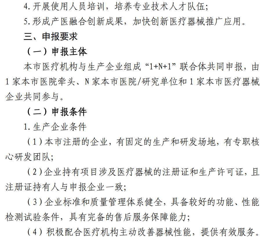 根據(jù)《通知》,由上海市醫(yī)療機構(gòu)與生產(chǎn)企業(yè)組成“1+N+1”聯(lián)合體共同申報,由1家本市醫(yī)院牽頭、N家本市醫(yī)院/研究單位和1家本市醫(yī)療器械企業(yè)共同參與。
