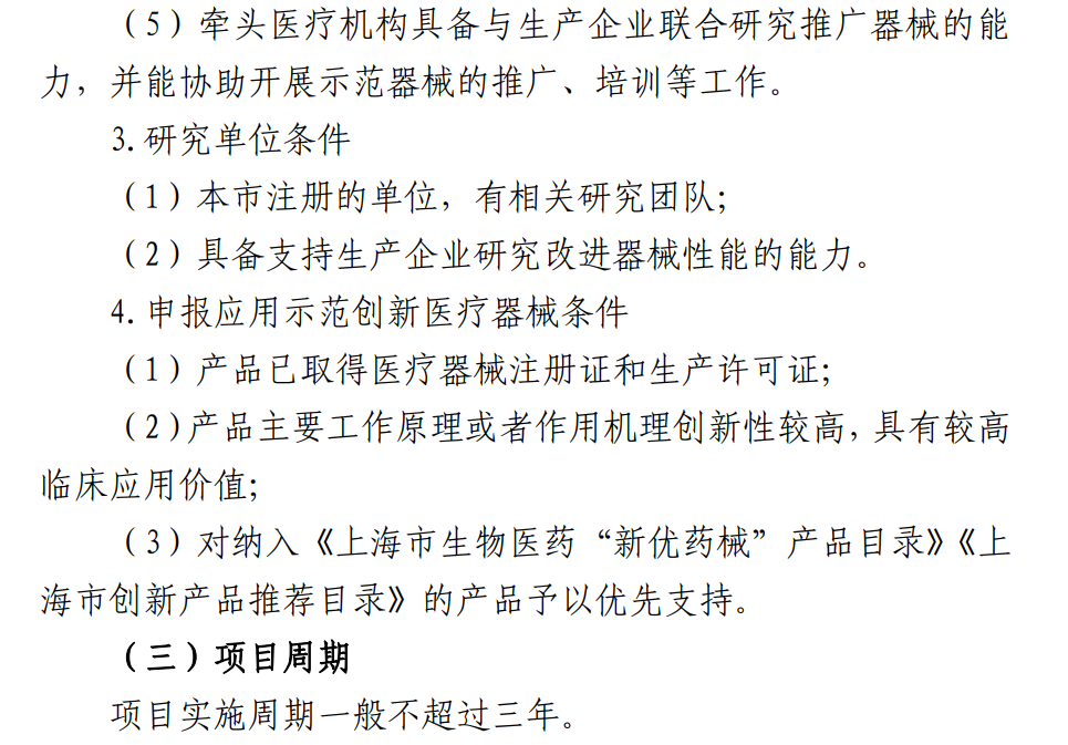 (1)取得醫(yī)療器械注冊證和生產(chǎn)許可證;(2)產(chǎn)品主要工作原理或者作用機理創(chuàng)新性較高,具有較高臨床應(yīng)用價值;(3)對納入《上海市生物醫(yī)藥“新優(yōu)藥械”產(chǎn)品目錄》《上海市創(chuàng)新產(chǎn)品推薦目錄》的產(chǎn)品予以優(yōu)先支持。