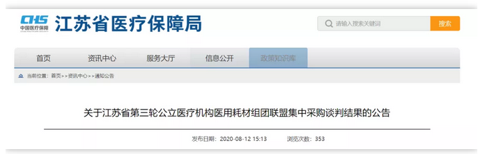 在此之前,根據中國江蘇網消息,江蘇省完成第三輪公立醫療機構醫用耗材組團聯盟集中采購談判,涉及全省超過700家醫療機構,帶量采購的品種涉及3大類1058個產品。