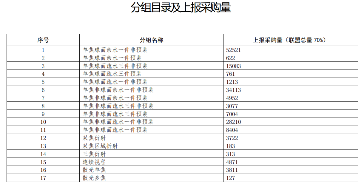 本次聯(lián)合帶量采購(gòu)品種為人工晶體,采購(gòu)周期為一年,對(duì)于采購(gòu)產(chǎn)品分組,將按功能屬性,結(jié)合各省上報(bào)采購(gòu)量,確定產(chǎn)品分組目錄,其中單焦晶體11組,多焦晶體4組,散光晶體2組。