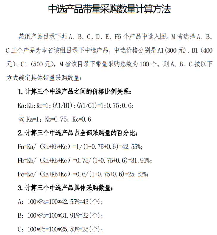 每個(gè)省(區(qū))從各組的中選產(chǎn)品中,確定本省該組的中選產(chǎn)品后,按中選產(chǎn)品價(jià)格之間的比例關(guān)系,具體計(jì)算每個(gè)中選產(chǎn)品的采購(gòu)數(shù)量,舉例如下: