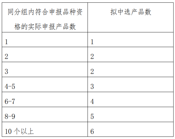 《采購(gòu)文件》公布了本次中選產(chǎn)品數(shù)量確定原則,同分組內(nèi)符合申報(bào)品種資格的實(shí)際申報(bào)產(chǎn)品數(shù)為10個(gè)以上的,擬中選產(chǎn)品數(shù)為6個(gè)。