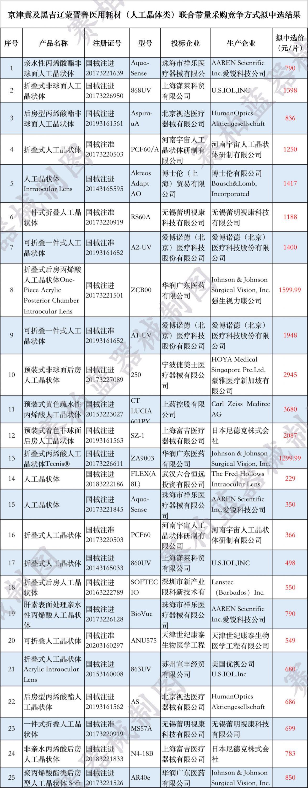 今年5月,京津冀及黑吉遼蒙晉魯醫(yī)藥聯(lián)合采購(gòu)辦公室公布人工晶體類耗材中選結(jié)果,中選企業(yè)包括強(qiáng)生視力康、愛(ài)博諾德、美國(guó)愛(ài)爾康、無(wú)錫蕾明視康等企業(yè)(文末附中標(biāo)企業(yè)及價(jià)格名單)。