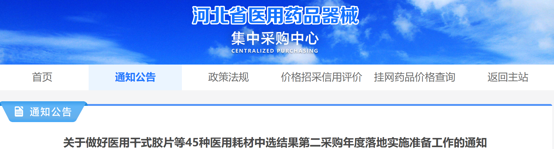 近日,河北省醫用藥品器械集中采購中心發布《關于做好醫用干式膠片等45種醫用耗材中選結果第二采購年度落地實施準備工作的通知》(簡稱《通知》)。