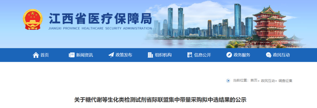 近日,江西醫(yī)保局發(fā)布《關(guān)于糖代謝等生化類檢測(cè)試劑省際聯(lián)盟集中帶量采購(gòu)擬中選結(jié)果的公示》(附文末),公示時(shí)間為2024年11月28日至2024年12月2日。