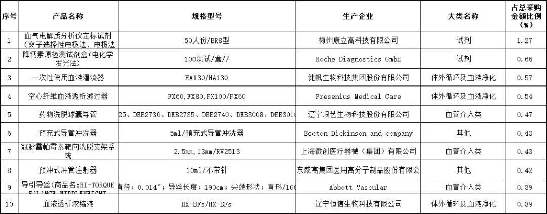 其中醫用耗材網上采購金額排名前10位如下表所示,合計金額為0.14億元,占醫用耗材總采購金額6.11%。