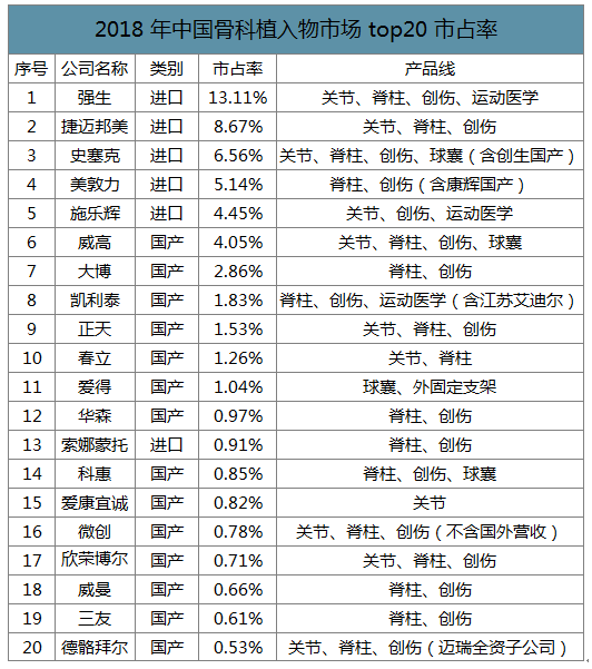 根據智研咨詢行業報告數據,2018年中國骨科植入物市場前5名及市場份額分別為:強生13.11%、捷邁邦美8.67%、史賽克6.56%、美敦力5.14%、施樂輝4.4%。