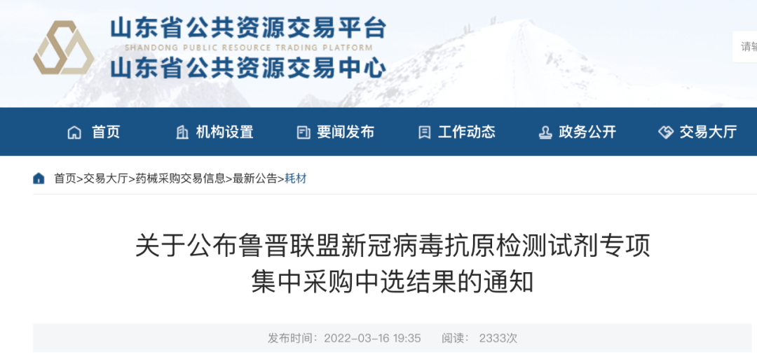 3月16日, 山東省公共資源交易中心公布《關(guān)于公布魯晉聯(lián)盟新冠病毒抗原檢測試劑專項(xiàng)集中采購中選結(jié)果的通知》(以下簡稱《通知》)。