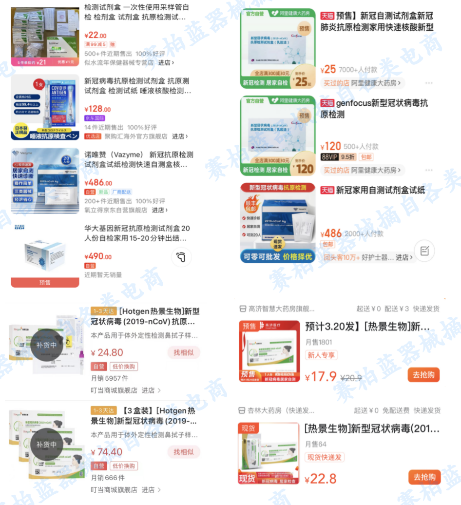 目前,線上線下醫(yī)藥零售平臺紛紛上架自測產(chǎn)品,各大品牌的上市出貨時間不一,價格也不同。有的是預(yù)售,有的可現(xiàn)貨速發(fā)。而有的已經(jīng)售罄,正在加急配貨中。