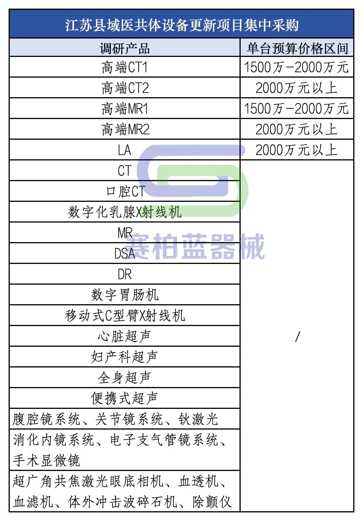 今年以來,江蘇省還對高端CT、高端MR和LA,以及腹腔鏡系統、關節鏡系統、鈥激光、消化內鏡系統、電子支氣管鏡系統、手術顯微鏡、超廣角共焦激光眼底相機、血透機、血濾機、體外沖擊波碎石機、除顫儀等設備開展了集中采購調研。