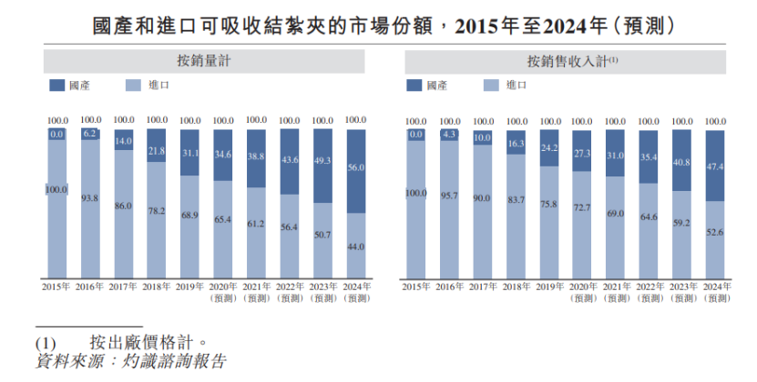 據灼識咨詢報告,預計到2024年中國結扎夾市場規模將達到40.86億元,其中高分子結扎夾市場規模28.33億元,2020-2024年復合增長率達25.2%,可吸收結扎夾市場規模12.53億元,2020-2024年復合增長率達29.2%。國產替代趨勢較為明顯。