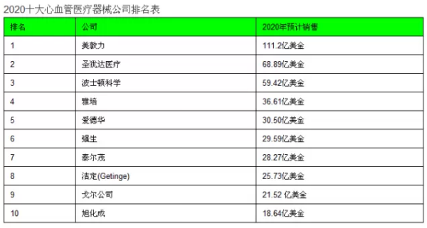 這份報告并沒有考慮美敦力將會并購柯惠醫療的事宜,而這次并購將增強美敦力在心血管市場的主導地位。如果加上柯惠醫療(排在這份榜單的第11位)的數據,2020年美敦力全球的銷售額將達到126億美金,占據全球22%的市場份額。