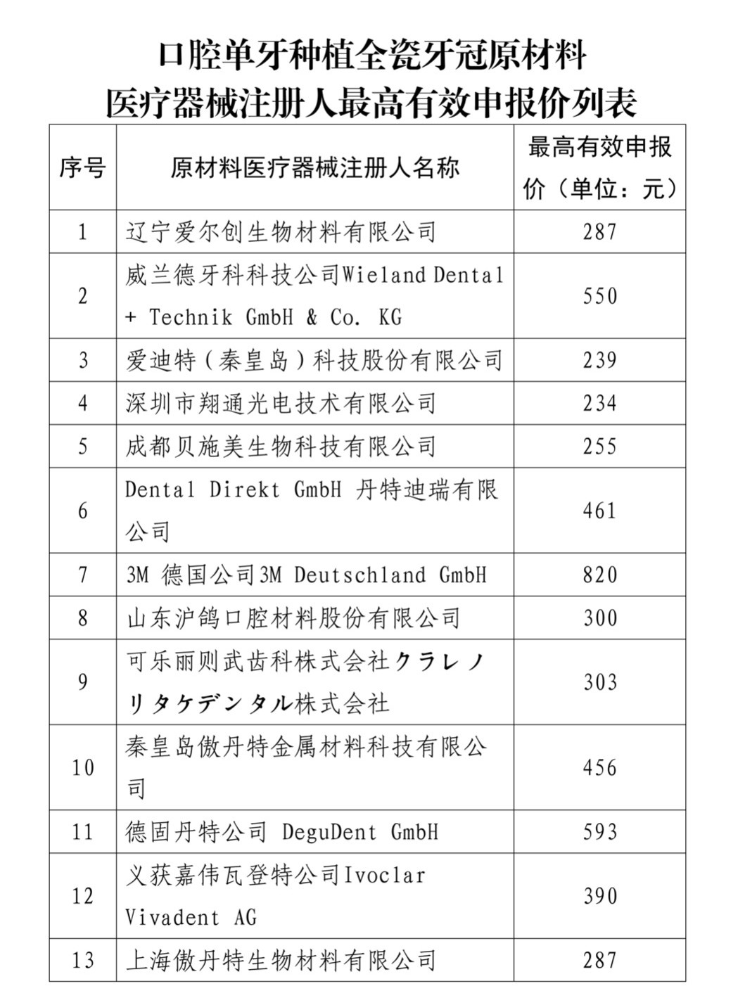 《通知》公布了各牙冠原材料醫療器械注冊人的最高有效申報價(見文末)。
