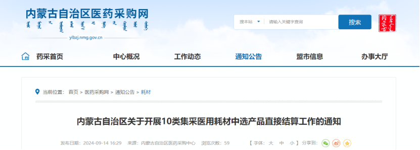 9月14日,內(nèi)蒙古自治區(qū)醫(yī)藥采購中心發(fā)布《內(nèi)蒙古自治區(qū)關(guān)于開展10類集采醫(yī)用耗材中選產(chǎn)品直接結(jié)算工作的通知》,其中明確,2024年10月1日起,對人工關(guān)節(jié)、脊柱類醫(yī)用耗材、骨水泥等10類集采中選產(chǎn)品開展直接結(jié)算工作。