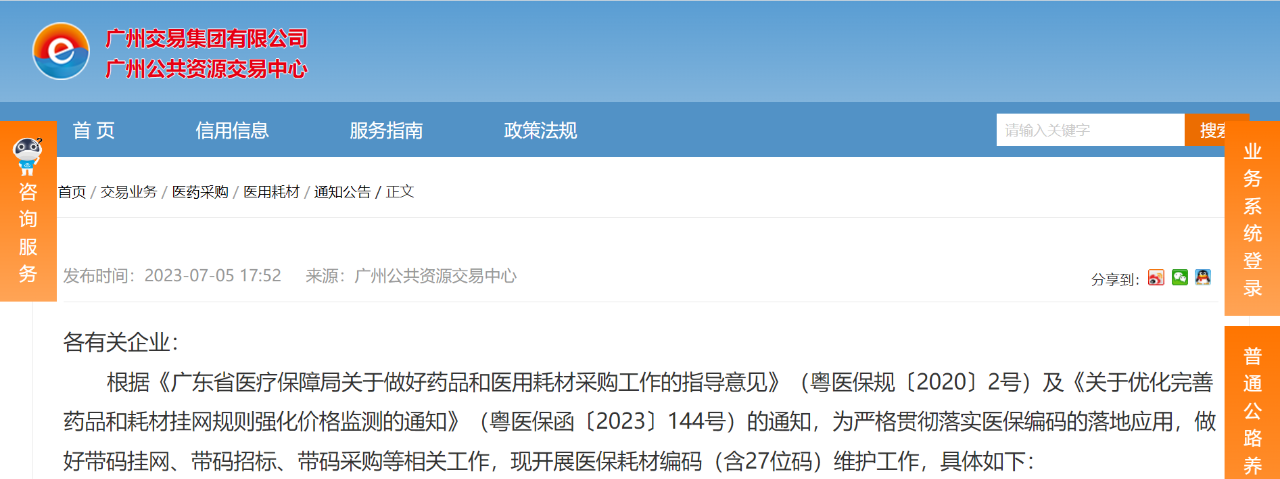7月5日,廣東省廣州公共資源交易中心也發布了《關于開展產品醫保耗材編碼更新維護工作的通知》。