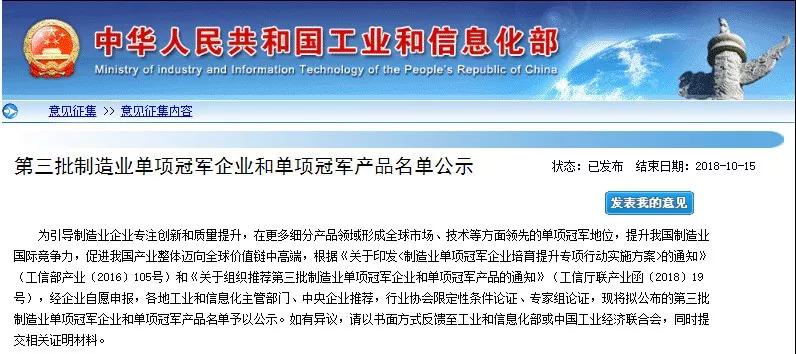 10月8日,中華人民共和國工業和信息化部對《第三批制造業單項冠軍企業和單項冠軍產品名單》進行公示。