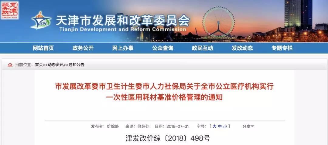 7月31日,天津市發(fā)展和改革委員會(huì)官網(wǎng)發(fā)布《市發(fā)展改革委市衛(wèi)生計(jì)生委市人力社保局關(guān)于全市公立醫(yī)療機(jī)構(gòu)實(shí)行一次性醫(yī)用耗材基準(zhǔn)價(jià)格管理的通知》(津發(fā)改價(jià)綜〔2018〕498號)(以下稱《通知》),對天津市所有公立醫(yī)院臨床使用的全部一次性醫(yī)用耗材實(shí)行新的價(jià)格管理機(jī)制,自8月1日起正式實(shí)施。