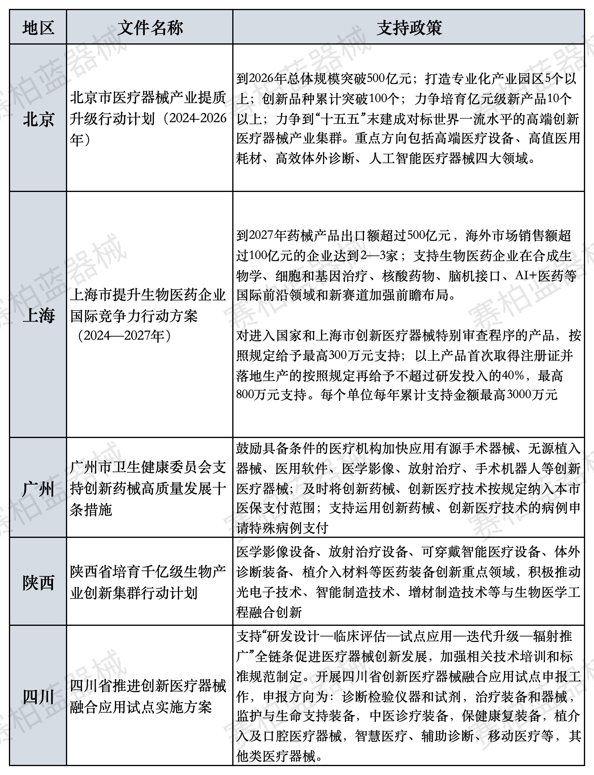 在國(guó)家局號(hào)召下,近期多地發(fā)布創(chuàng)新醫(yī)療器械支持政策,包括北京、上海、四川、陜西、廣州等省市。