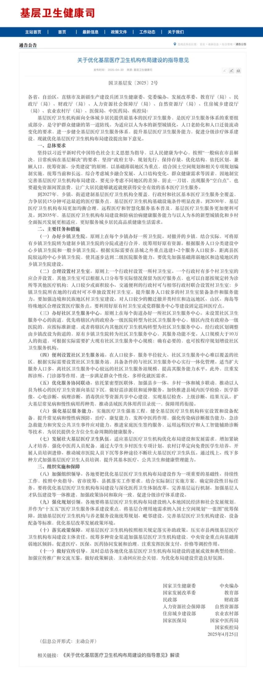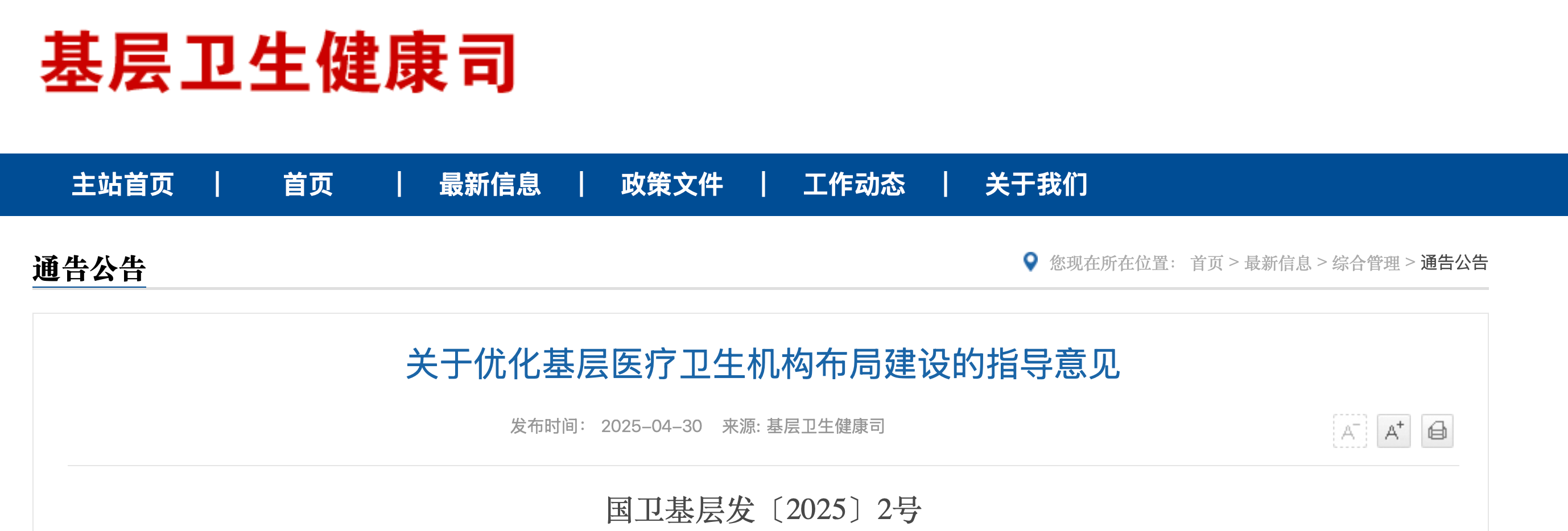 基層醫(yī)療設(shè)施建設(shè)升級推動我國醫(yī)療整體水平的關(guān)鍵。在2025年政府工作報告中,“促進(jìn)優(yōu)質(zhì)醫(yī)療資源擴(kuò)容下沉和區(qū)域均衡布局,實(shí)施醫(yī)療衛(wèi)生強(qiáng)基工程”被寫入其中。