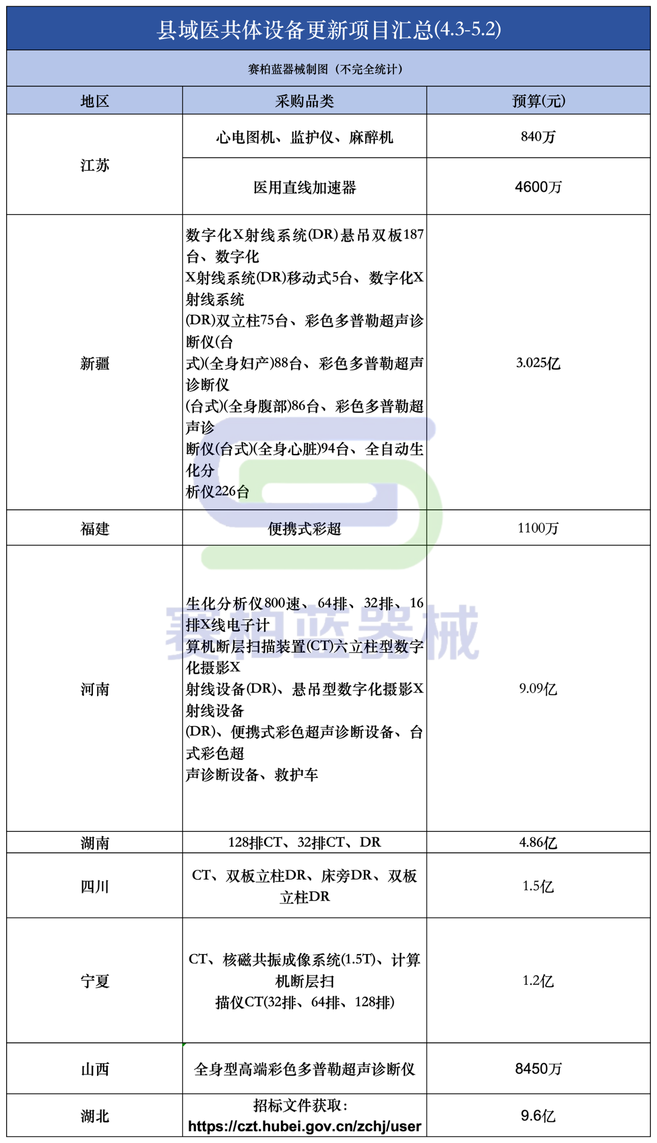 賽柏藍(lán)器械查詢發(fā)現(xiàn),僅近一個月內(nèi),中國政府采購網(wǎng)關(guān)于“縣域醫(yī)共體”的醫(yī)療設(shè)備相關(guān)招采就有近50個,包括浙江、黑龍江、山西、四川、江蘇、新疆、河南、福建、寧夏、湖北、山東等地。
