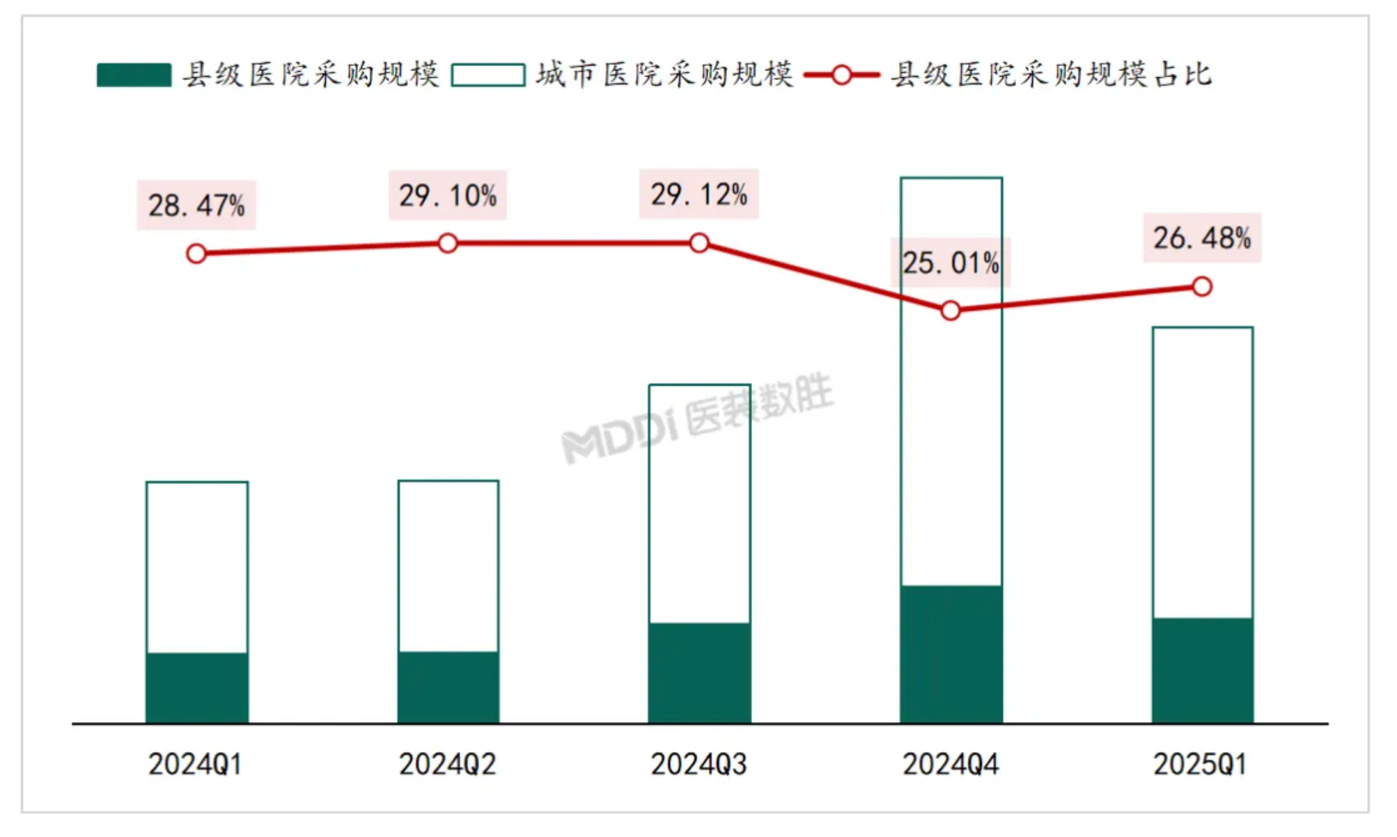 (2024-2025年3月國內(nèi)公立醫(yī)院醫(yī)療設(shè)備采購規(guī)模及縣級醫(yī)院占比季度變化)