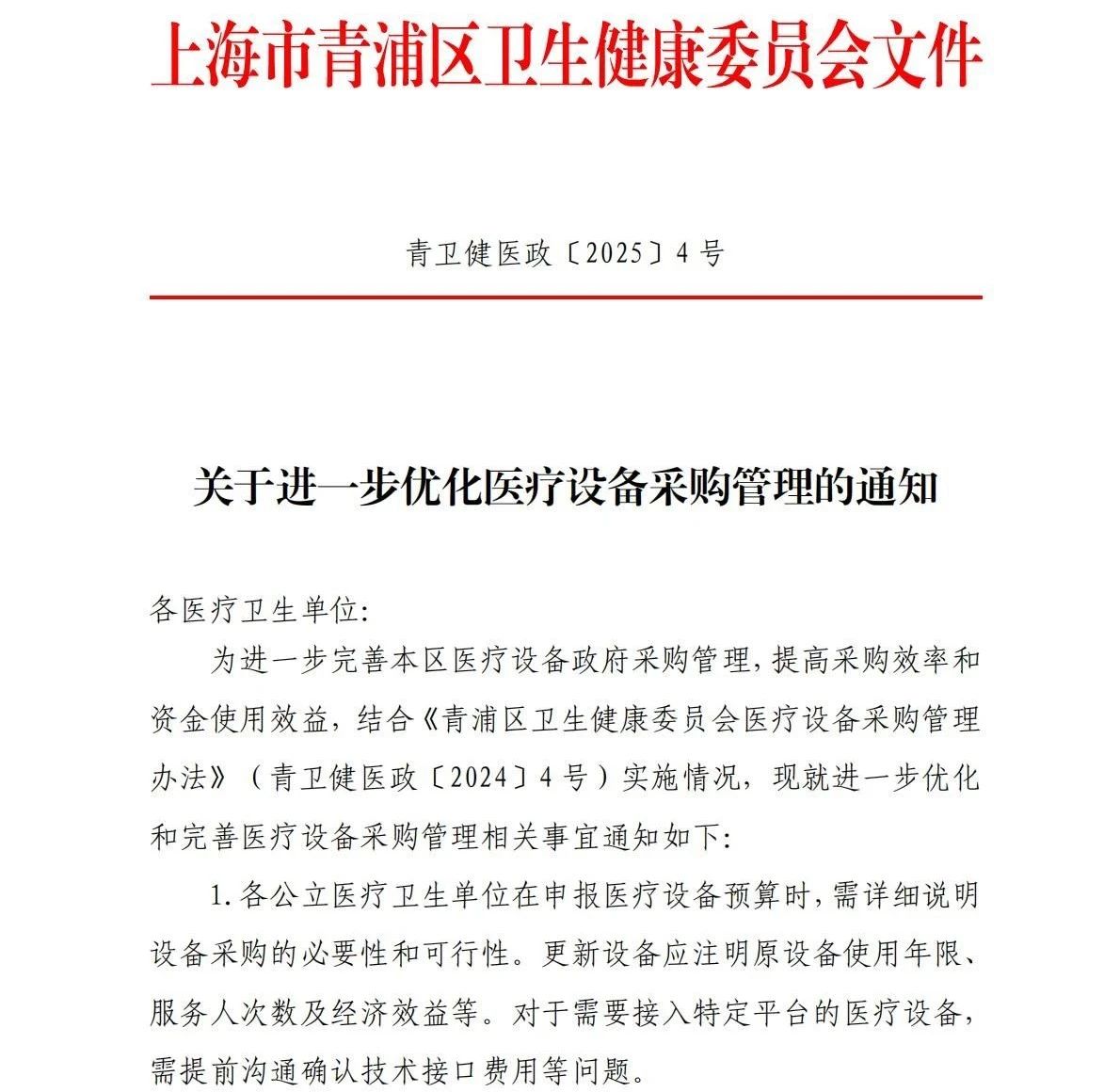 此外,在設備采購管理的政策上也有細化和調整,對相關采購管理提出更高要求。日前,上海市青浦區衛健委發布《關于進一步優化醫療設備采購管理的通知》(簡稱《通知》),覆蓋申報要求、時間規劃、采購形式、質控督查等諸多細則(完整見文末)。