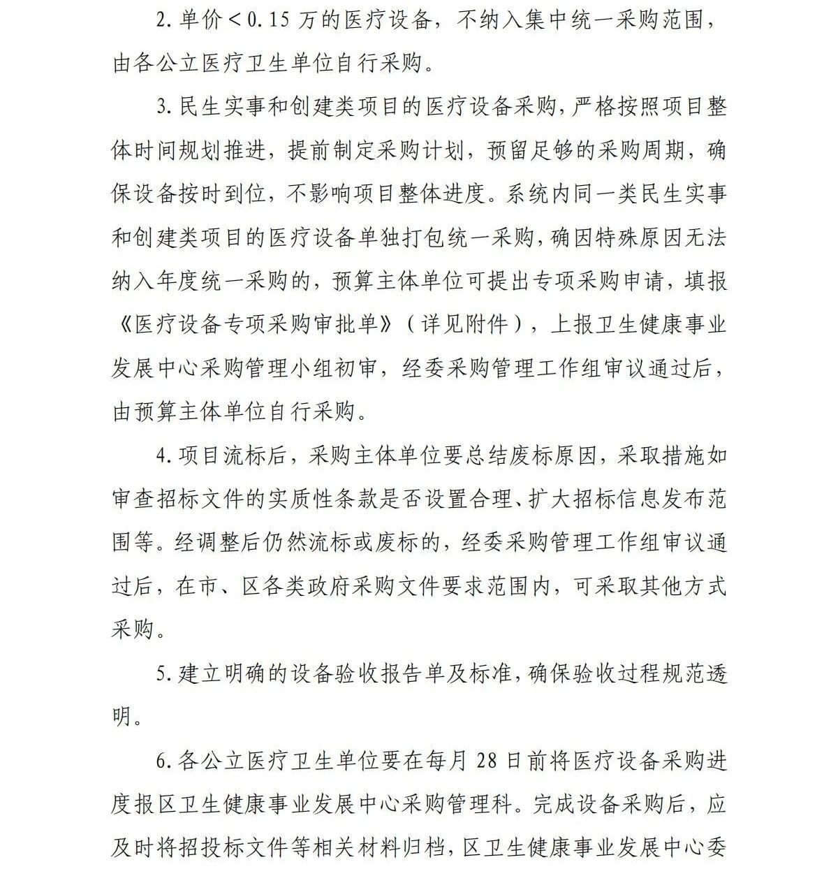 此外,并非所有醫療設備均需集中采購。青浦區要求,單價<0.15萬的醫療設備,不納入集中統一采購范圍,由各公立醫療衛生單位自行采購;確因特殊原因無法納入年度統一采購的,預算主體單位可提出專項采購申請,經有關部門審議通過后,由預算主體單位自行采購。在醫療設備采購過程中,受采購計劃變動、參與人數不足等客觀因素影響,采購項目中止的情況時有發生。《通知》中提到,項目流標后采購主體單位要總結廢標原因,采取措施如審查招標文件的實質性條款是否設置合理、擴大招標信息發布范圍等。經調整后仍然流標或廢標的,經委采購管理工作組審議通過后,在市、區各類政府采購文件要求范圍內,可采取其他方式采購。