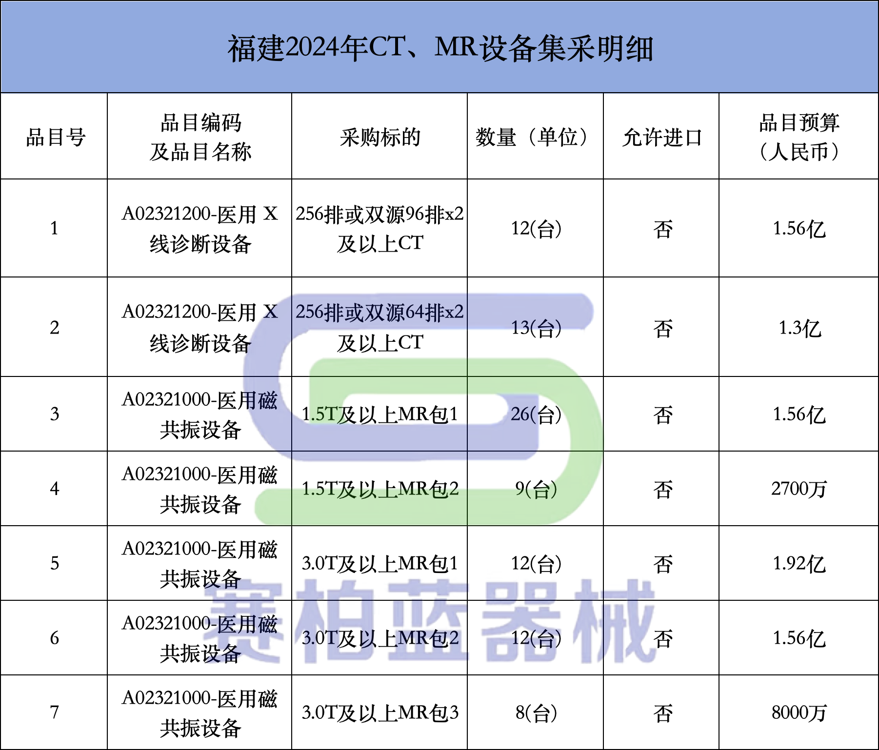 根據(jù)公告,此次福建設(shè)備集采共分7個采購包,分別為256排及以上CT包1、256排及以上CT包2、1.5T及以上MR包1、1.5T及以上MR包2、3.0T及以上MR包1、3.0T及以上MR包2、3.0T及以上MR包3,各自的詳細(xì)如下: