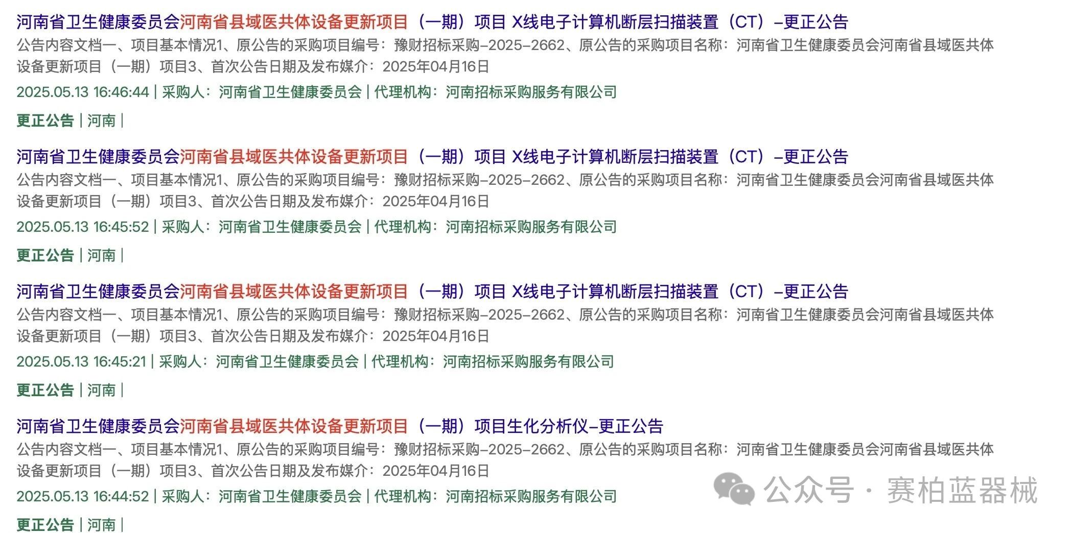 5月13日,即項目中止官宣兩天后,中國政府采購網接連發布四則更正公告,河南省縣域醫共體設備更新項目(一期)項目重新開始推進。