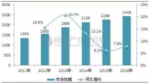 近年來,不斷涌起的投資兼并浪潮也在一定程上助推了醫(yī)療器械行業(yè)市場規(guī)模的不斷提升。《2017-2022年中國醫(yī)療器械行業(yè)市場需求預測與投資戰(zhàn)略規(guī)劃分析報告》顯示,2011年,醫(yī)療器械行業(yè)市場規(guī)模1354億元,2014年突破2000億元,2016年市場規(guī)模達到2448億元,同比增長7.9%,2011-2016年均復合增長12.57%。