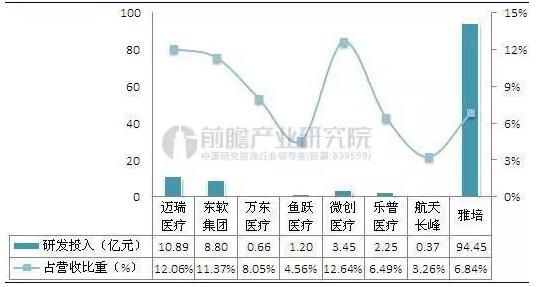 從絕對值來看,而同時期國內一些領先的醫(yī)療器械企業(yè)的研發(fā)投入以深圳邁瑞醫(yī)療為最高,為10.89億元,僅占雅培的11%左右;從占營收的比重來看,邁瑞醫(yī)療、東軟集團(600718)以及微創(chuàng)醫(yī)療、萬東醫(yī)療(600055)等在研發(fā)的投入水平逐漸在升高,占營收的比重分別是12.06%、11.37%、12.64%、8.05%。