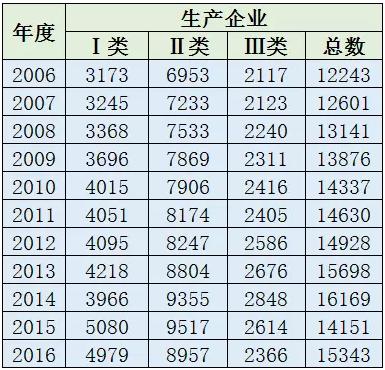在2015年之前,藥監歷年年報數據,關于醫療器械經營企業一直都是只有持證企業總數這一項內容的。2015年度,開始分別給出了經營二類和三類醫械產品的企業數據。2016年度,則進一步細化為僅經營二類、僅經營三類、同時經營二三類這三項去各自統計。
