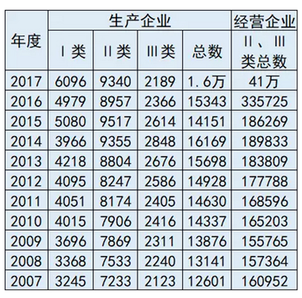 以下為2007~2017中國醫(yī)療器械生產(chǎn)經(jīng)營企業(yè)數(shù)量變化情況: