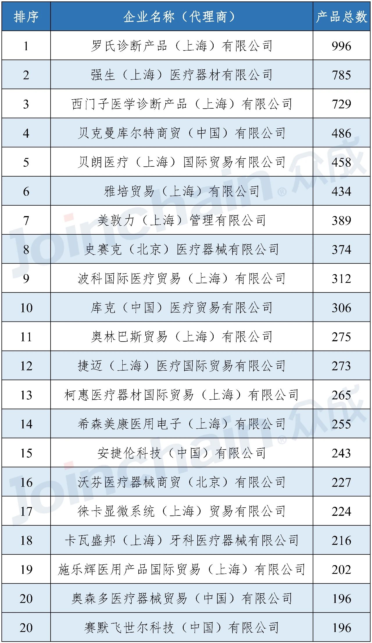 目前醫(yī)療器械外企數(shù)量共計(jì)2504家,平均產(chǎn)品注冊(cè)10.6件/家。從外企的產(chǎn)品注冊(cè)數(shù)量看,羅氏診斷產(chǎn)品數(shù)量達(dá)996件,位居第一;強(qiáng)生醫(yī)療器械785件,排名第二;西門子醫(yī)學(xué)診斷產(chǎn)品729件,排名第三;排名前十的還有貝克曼庫(kù)爾特(486件)、貝朗醫(yī)療(458件)、雅培(434件)、美敦力(389件)、史賽克(374件)、波科(312件)、庫(kù)克(306件)。