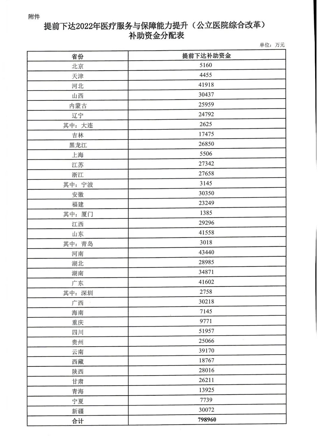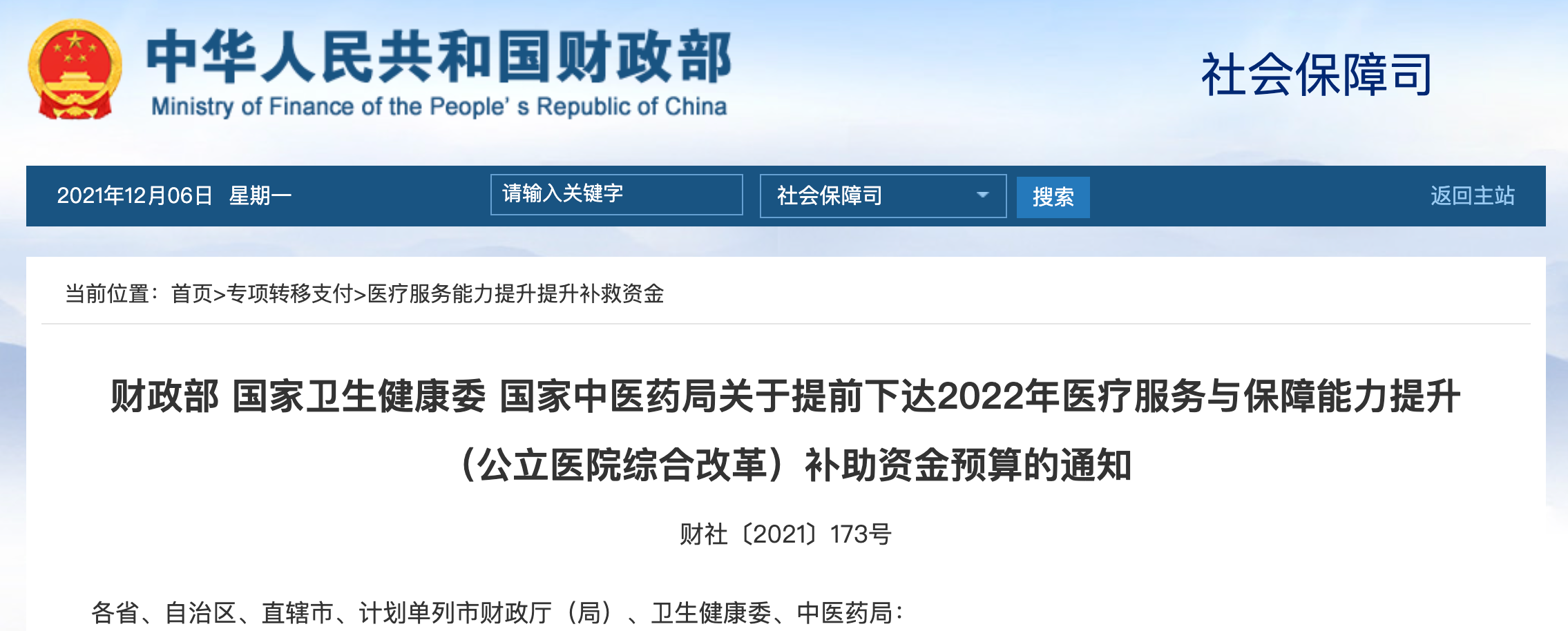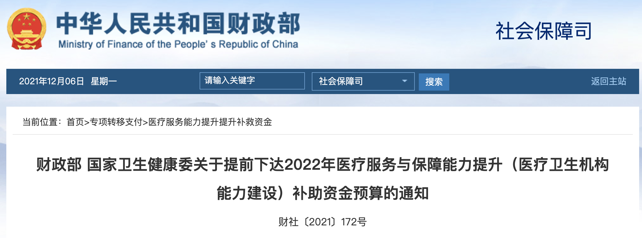 同一天,財政部、國家衛生健康委發布《關于提前下達2022年醫療服務與保障能力提升(醫療衛生機構能力建設)補助資金預算的通知》。