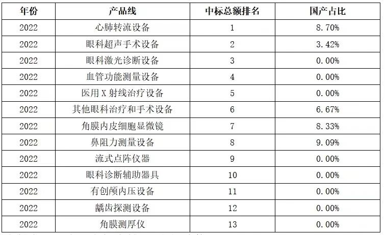據(jù)眾成數(shù)科統(tǒng)計(jì),在2022年我國(guó)國(guó)產(chǎn)產(chǎn)品公開(kāi)中標(biāo)金額低于10%的產(chǎn)品共有13項(xiàng),相比較去年減少了2個(gè)。從具體產(chǎn)品線來(lái)看,心肺流轉(zhuǎn)設(shè)備中標(biāo)金額位居首位,眼科超聲手術(shù)設(shè)備和眼科激光診斷設(shè)備分居第二、三位。