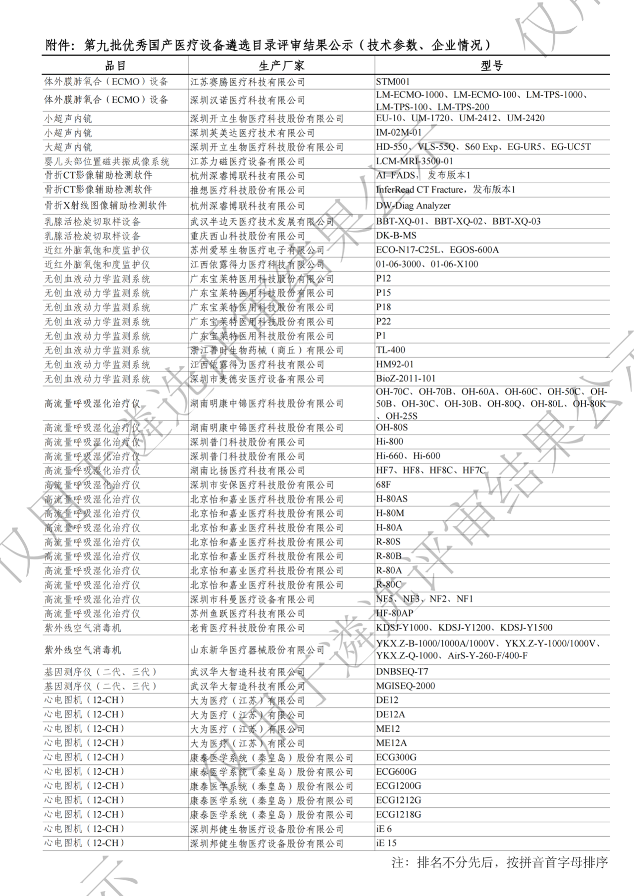 第九批優(yōu)秀國(guó)產(chǎn)醫(yī)療設(shè)備產(chǎn)品遴選品目包括:體外膜肺氧合(ECMO)設(shè)備、超聲內(nèi)窺鏡系統(tǒng)、嬰兒頭部位置磁共振成像系統(tǒng)、人工智能輔助影像診斷(骨折)、乳腺活檢旋切取樣設(shè)備、近紅外腦氧飽和度監(jiān)護(hù)儀、無(wú)創(chuàng)血液動(dòng)力學(xué)監(jiān)測(cè)系統(tǒng)、高流量呼吸濕化治療儀、移動(dòng)空氣滅菌設(shè)備(紫外線空氣消毒機(jī))、步態(tài)訓(xùn)練與評(píng)估系統(tǒng)、內(nèi)熱式針灸治療儀、基因測(cè)序儀(二代、三代);