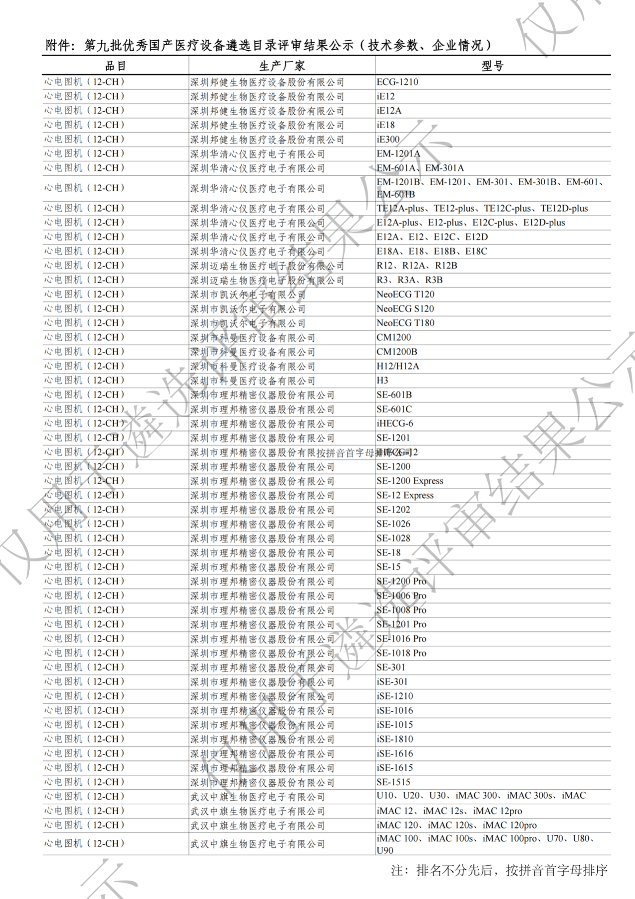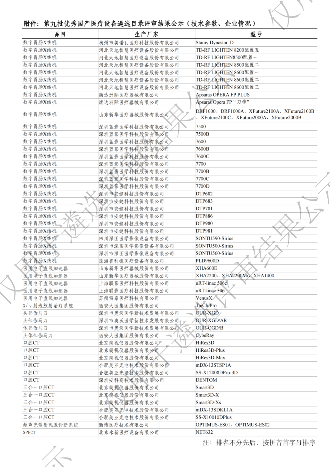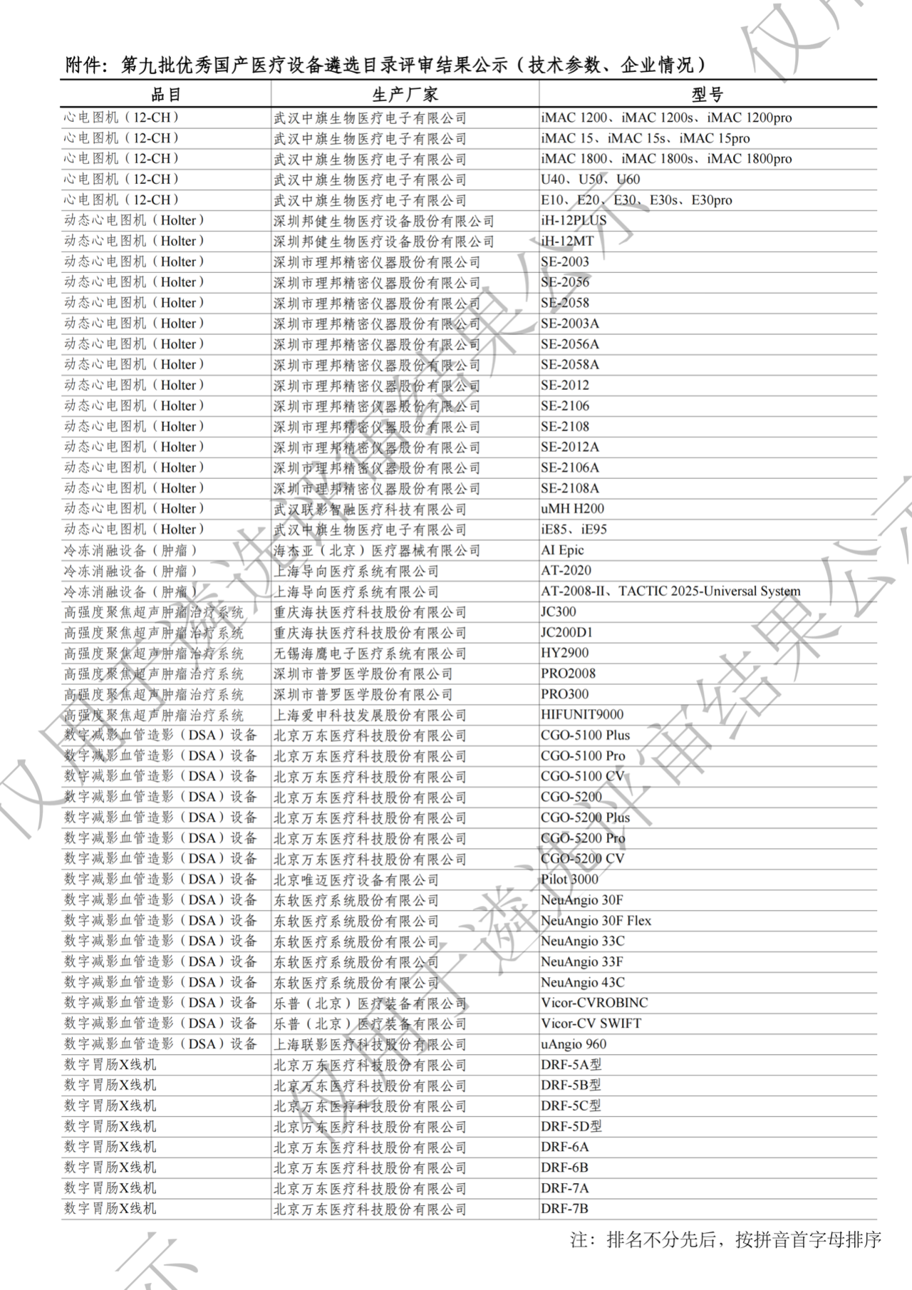心電圖機(jī)(12-CH)、動(dòng)態(tài)心電圖機(jī)(Holter)、醫(yī)用電子直線加速器、γ-射線立體定向治療系統(tǒng)、高強(qiáng)度聚焦超聲腫瘤治療系統(tǒng)、數(shù)字減影血管造影(DSA)設(shè)備、清洗消毒設(shè)備(壓力蒸汽滅菌消毒、全自動(dòng)清洗消毒、脈動(dòng)真空清洗消毒、環(huán)氧乙烷滅菌、過(guò)氧化氫低溫等離子滅菌、軟式內(nèi)鏡清洗消毒、翻蓋式全自動(dòng)軟式內(nèi)鏡清洗消毒、超聲波清洗)、化學(xué)發(fā)光免疫分析儀(全自動(dòng)、小型全自動(dòng)、單人份、便攜式4個(gè)子品目)、全自動(dòng)酶聯(lián)免疫分析儀(微板)、冷凍消融設(shè)備(腫瘤)、超聲骨刀、SPECT、數(shù)字胃腸X線機(jī)、口腔CT設(shè)備、心肺復(fù)蘇機(jī)、醫(yī)用制氧機(jī)、超聲光散射乳腺診斷系統(tǒng)、康復(fù)設(shè)備(定位牽引系統(tǒng)、振動(dòng)排痰系統(tǒng)、吞咽神經(jīng)和電刺激儀、空氣波壓力治療儀、激光磁場(chǎng)理療儀、脊柱定位減壓系統(tǒng))、眼底照相機(jī)、飛行時(shí)間質(zhì)譜儀、實(shí)時(shí)熒光定量PCR儀(全自動(dòng)、便攜式)、全自動(dòng)核酸提取儀、全自動(dòng)血型分析儀。