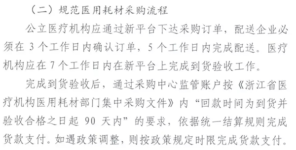 《浙江省“三流合一”醫(yī)用耗材采購(gòu)新平臺(tái)推進(jìn)工作方案》明確提出,“回款時(shí)間為到貨并驗(yàn)收合格之日起90天內(nèi)”。