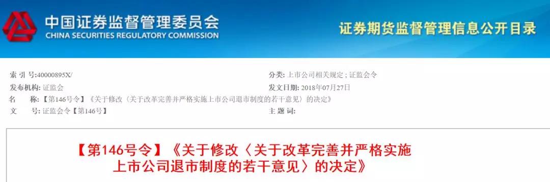 7月27日晚間,中國證監(jiān)會(huì)發(fā)布《關(guān)于修改<關(guān)于改革完善并嚴(yán)格實(shí)施上市公司退市制度的若干意見>的決定》(以下簡稱《決定》)。在公眾健康安全等領(lǐng)域的重大違法行為的上市公司,要強(qiáng)制退市!