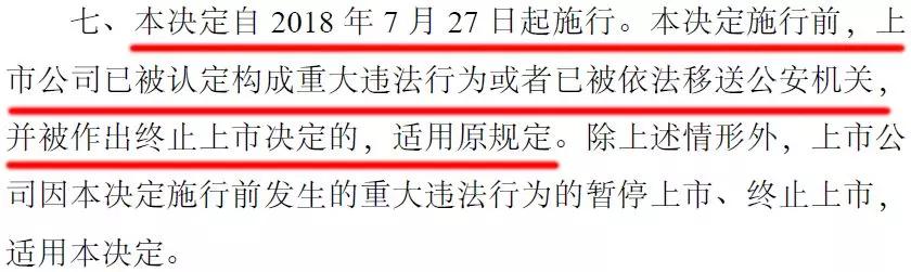 證監(jiān)會(huì)表示,本《決定》施行前,上市公司已被認(rèn)定構(gòu)成重大違法行為或者已被依法移送公安機(jī)關(guān),并被作出終止上市決定的,適用原規(guī)定。除上述情形外,上市公司因本決定施行前發(fā)生的重大違法行為的暫停上市、終止上市,適用本決定。