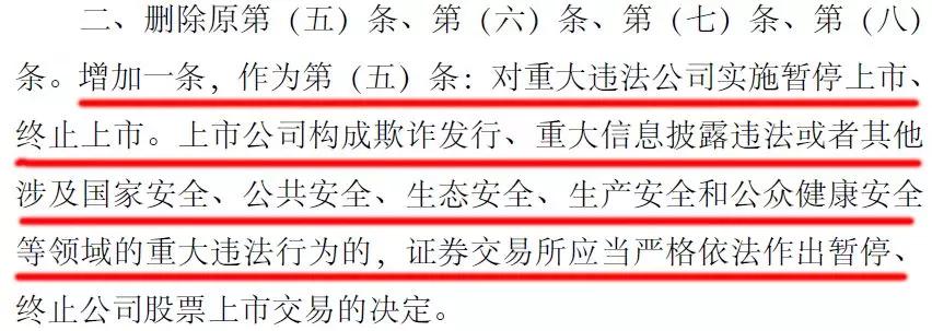 證監(jiān)會(huì)對退市制度的修改,最重要的一條就是明確了,上市公司涉及到公共安全、生態(tài)安全、生產(chǎn)安全和公眾健康安全等領(lǐng)域的重大違法行為的,證券交易所應(yīng)當(dāng)嚴(yán)格依法作出暫停、終止公司股票上市交易決定。