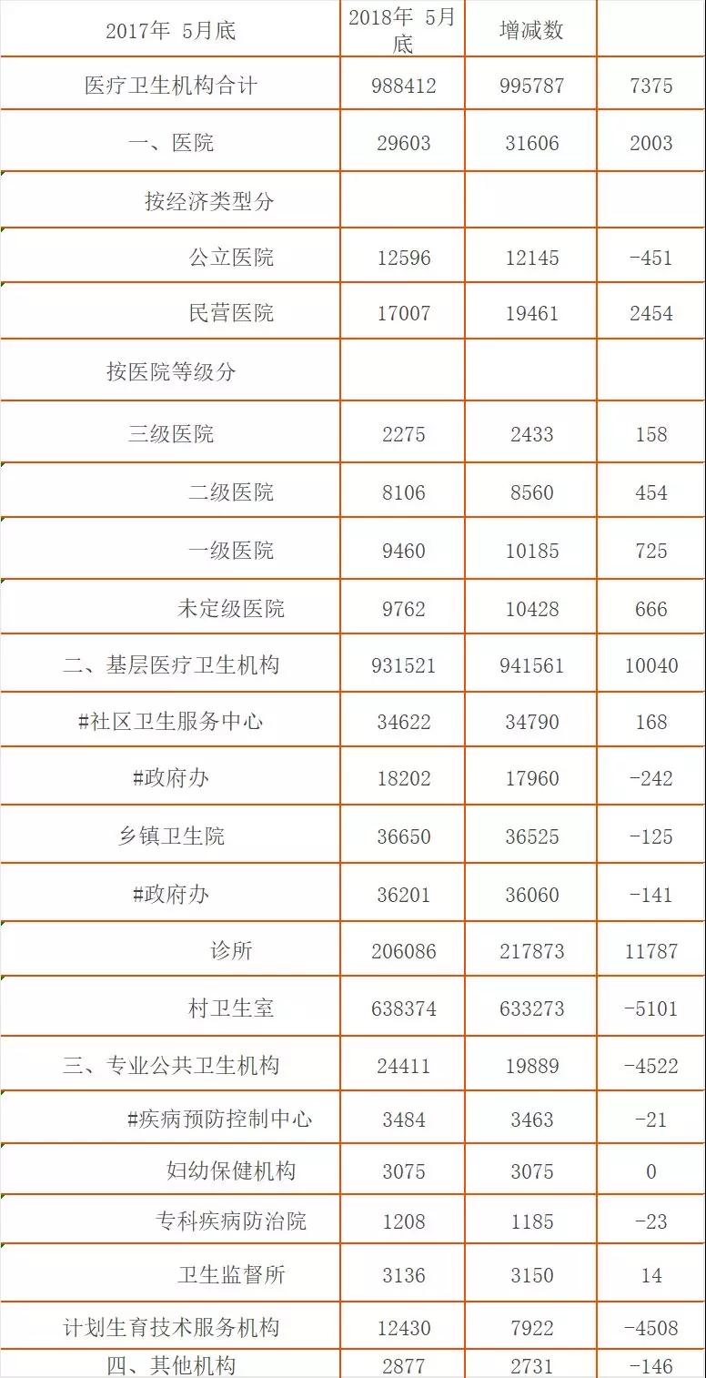 據衛健委數據,截至2018年5月底,醫院3.2萬個,其中:公立醫院12145個,民營醫院19461個。與2017年5月底比較,公立醫院減少451個,民營醫院增加2454個。
