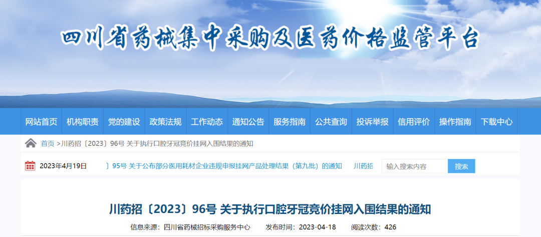 4月19日,四川省藥械招標(biāo)采購(gòu)服務(wù)中心發(fā)布關(guān)于《川藥招〔2023〕96號(hào) 關(guān)于執(zhí)行口腔牙冠競(jìng)價(jià)掛網(wǎng)入圍結(jié)果的通知》(簡(jiǎn)稱《通知》)。