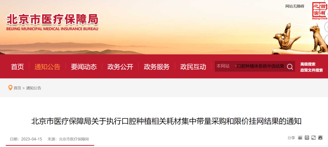 4月15日,北京市醫(yī)保局官網(wǎng)發(fā)布《北京市醫(yī)療保障局關(guān)于執(zhí)行口腔種植相關(guān)耗材集中帶量采購(gòu)和限價(jià)掛網(wǎng)結(jié)果的通知》,公布了北京市口腔種植體系統(tǒng)中選結(jié)果,自4月20日,各中選企業(yè)、配送企業(yè)、醫(yī)療機(jī)構(gòu)簽訂三方協(xié)議,執(zhí)行網(wǎng)上采購(gòu)。