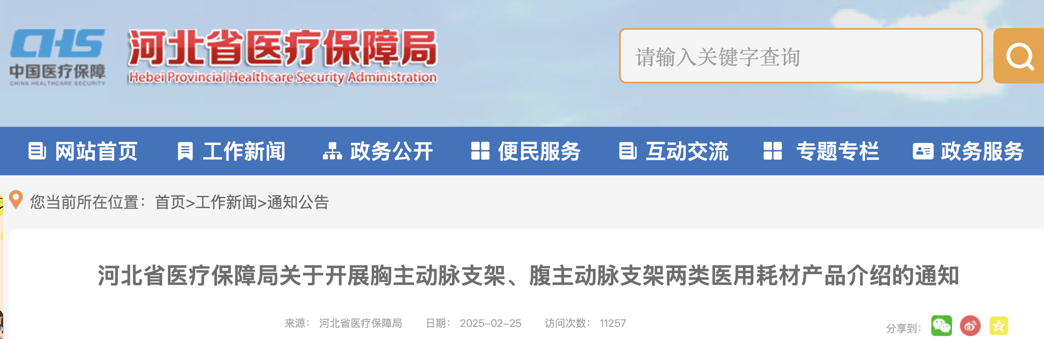 2月25日,河北醫保局發布《關于開展胸主動脈支架、腹主動脈支架兩類醫用耗材產品介紹的通知》(簡稱《通知》)。