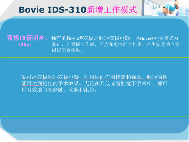 美國Bovie新一代數(shù)字高頻電刀IDS-310專為臨床醫(yī)生設(shè)計,提供了一個安全、用戶界面友好,能夠滿足所有手術(shù)室程序的性能要求。這一創(chuàng)新的技術(shù)基于高頻電刀主機提供了輸出的13種模式。包括新一代的Bovie雙極,自動雙極和特殊的腹腔鏡手術(shù)模式。這些功能為外科手術(shù)的應(yīng)用和操作提供了所需要的強大能量源,為醫(yī)生選擇不同電外科手術(shù)效果,提供了最大方便性和安全性!